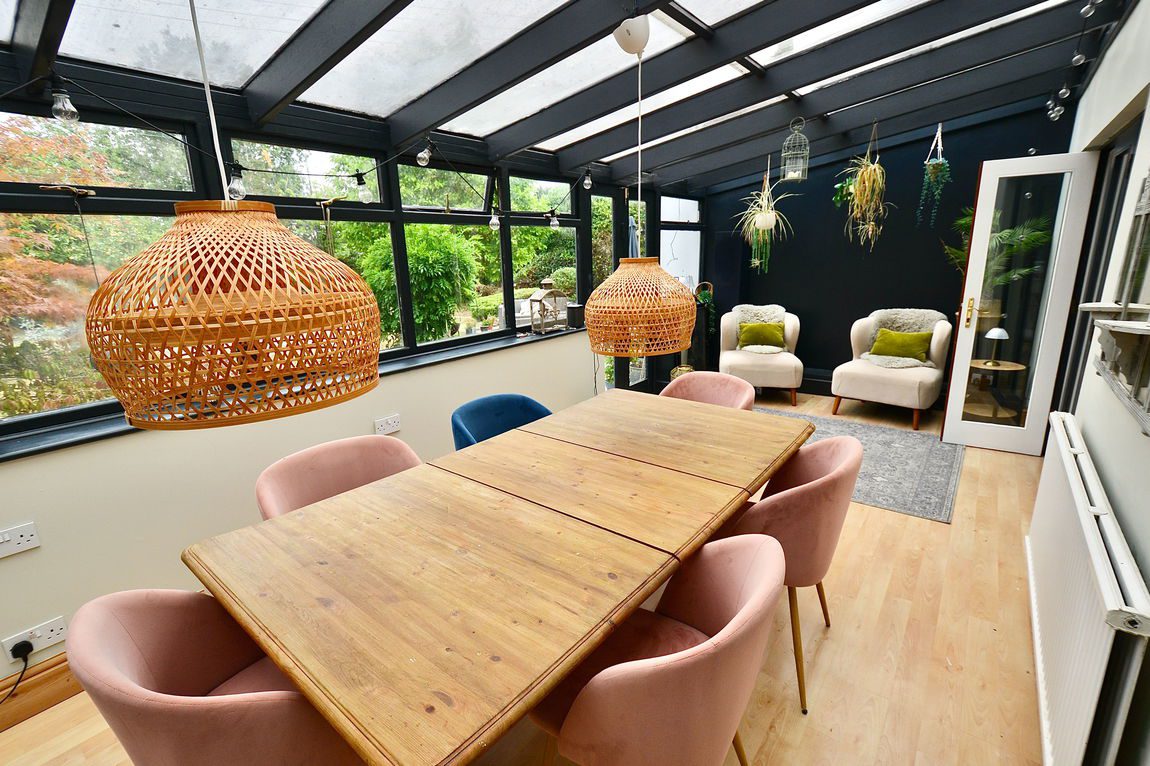The ground floor opens with a welcoming entrance hall. The sitting room is cosy and inviting, featuring a bay window and open fire, while the dining room provides an excellent space for entertaining. A wood-panelled family room with feature fireplace connects through to both the study and the conservatory. The conservatory, enjoying views over the rear garden, provides direct access to the paved terrace, making it a perfect spot for relaxing or entertaining.