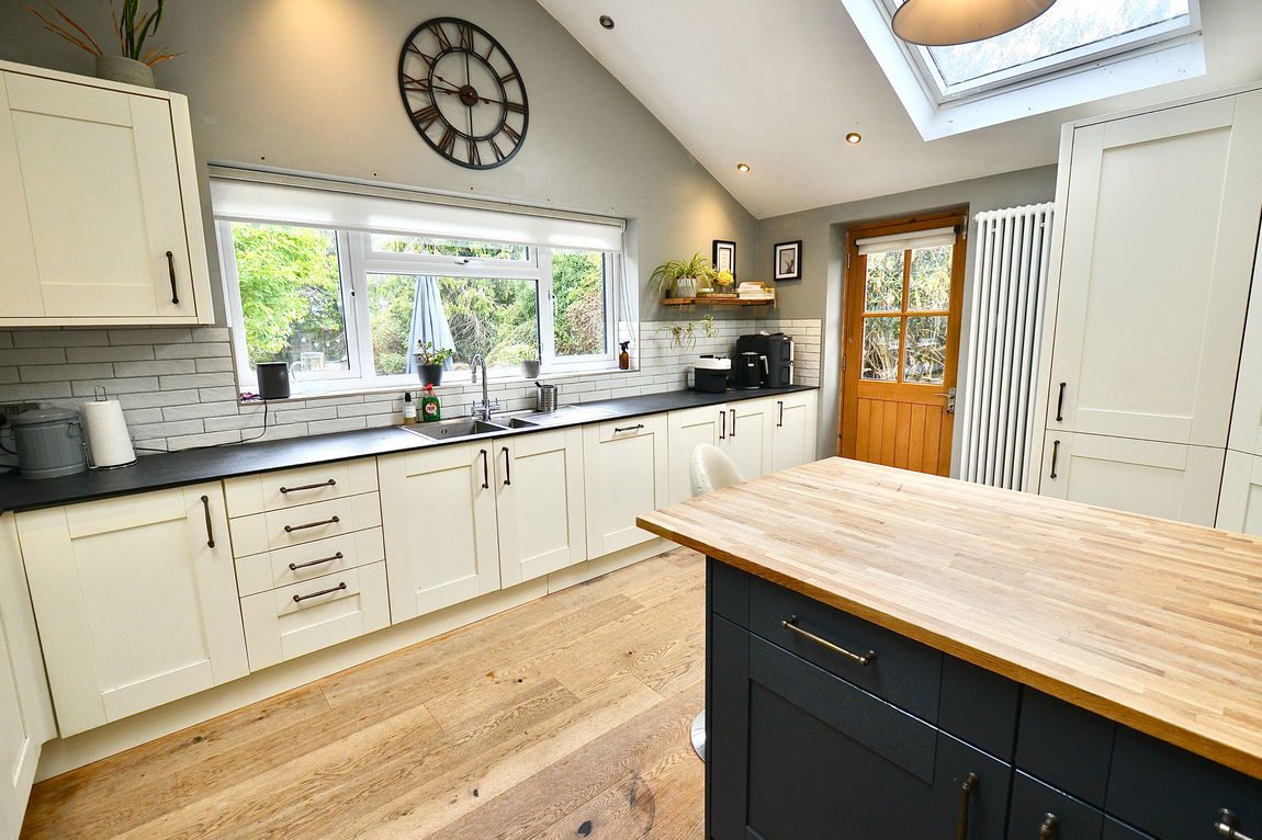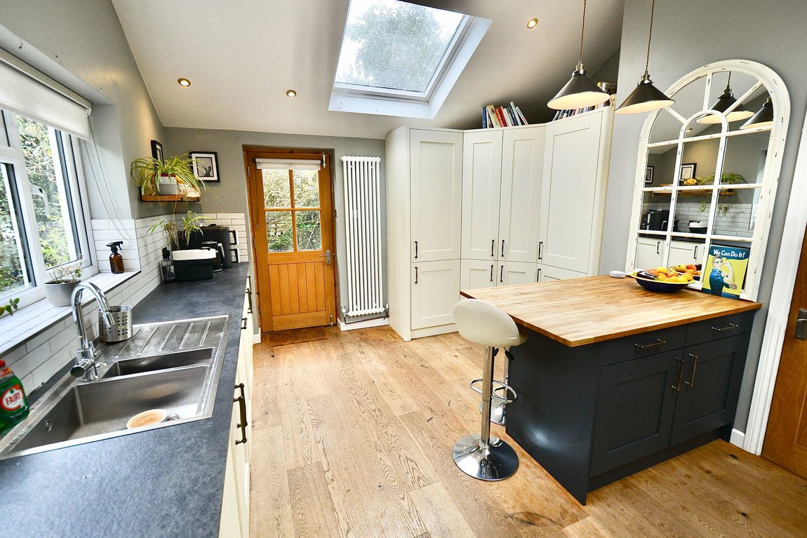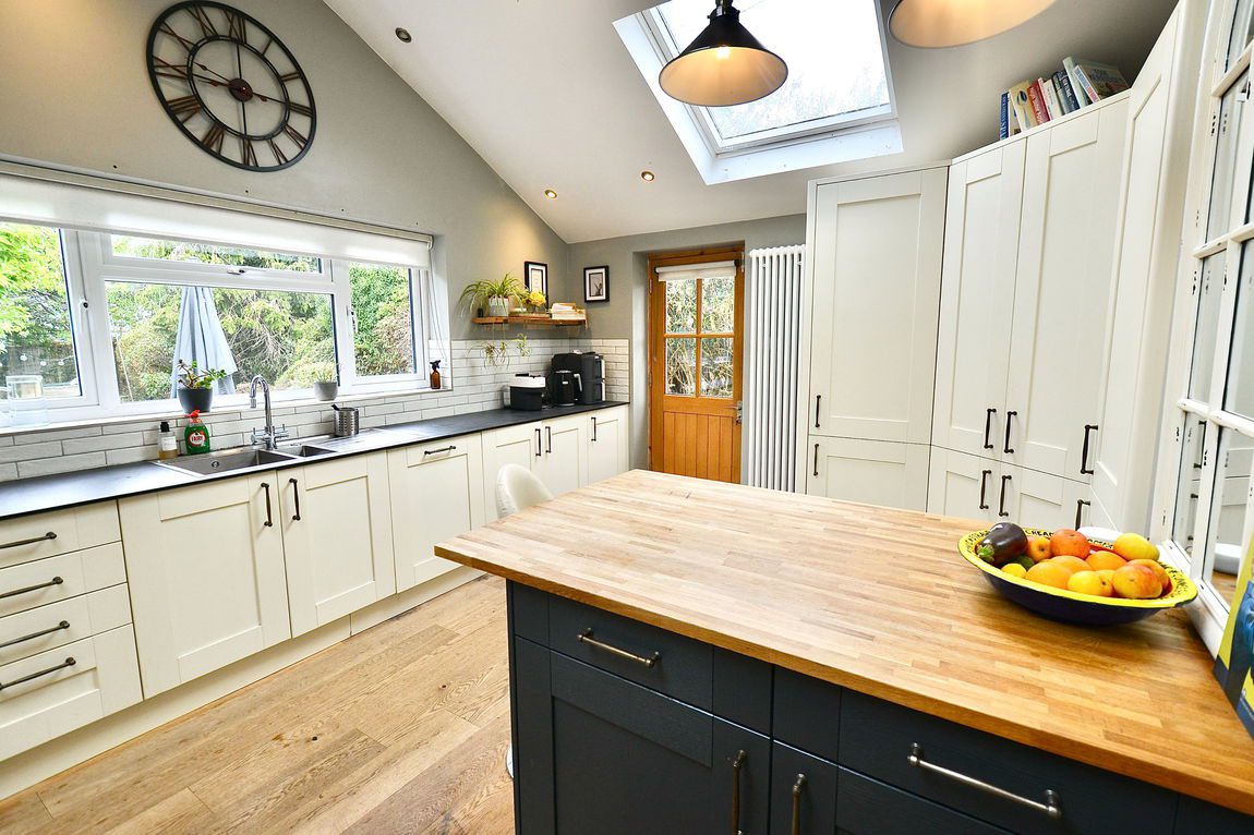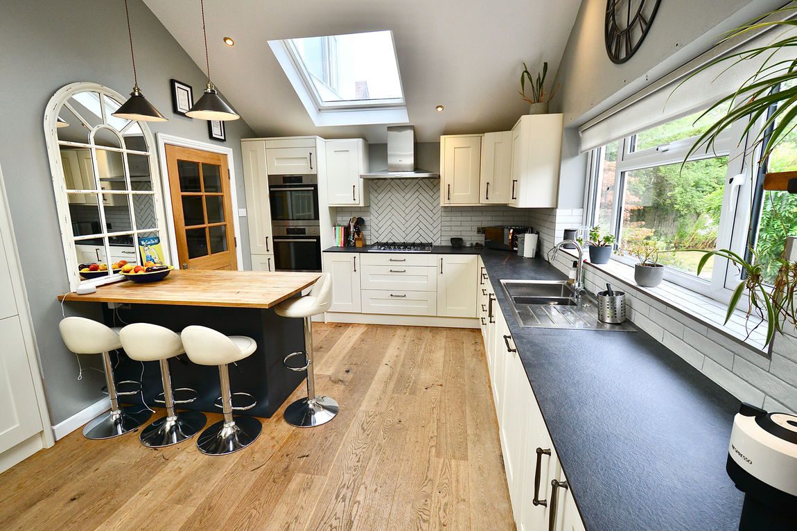 - Modern kitchen/breakfast room with vaulted ceilings, Velux windows, central island, larder, double oven, and five-ring gas hob