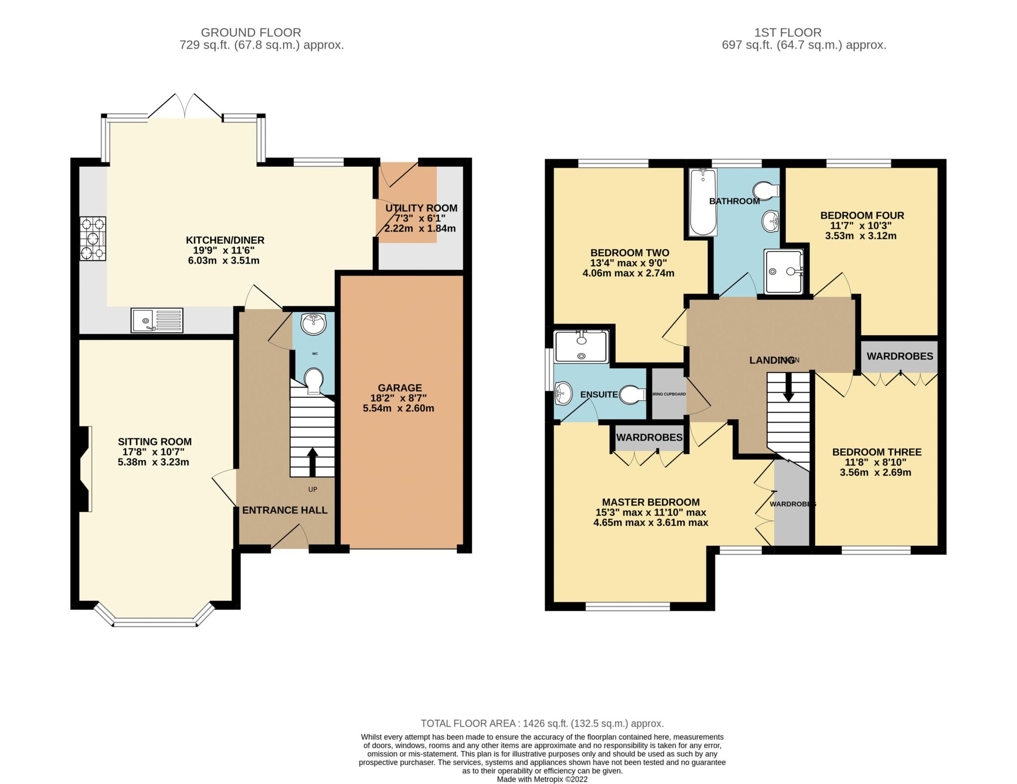 On the first floor there are four double bedrooms, a family bathroom with separate shower and the master bedroom has its own ensuite. The master also has lots of built-in wardrobes.