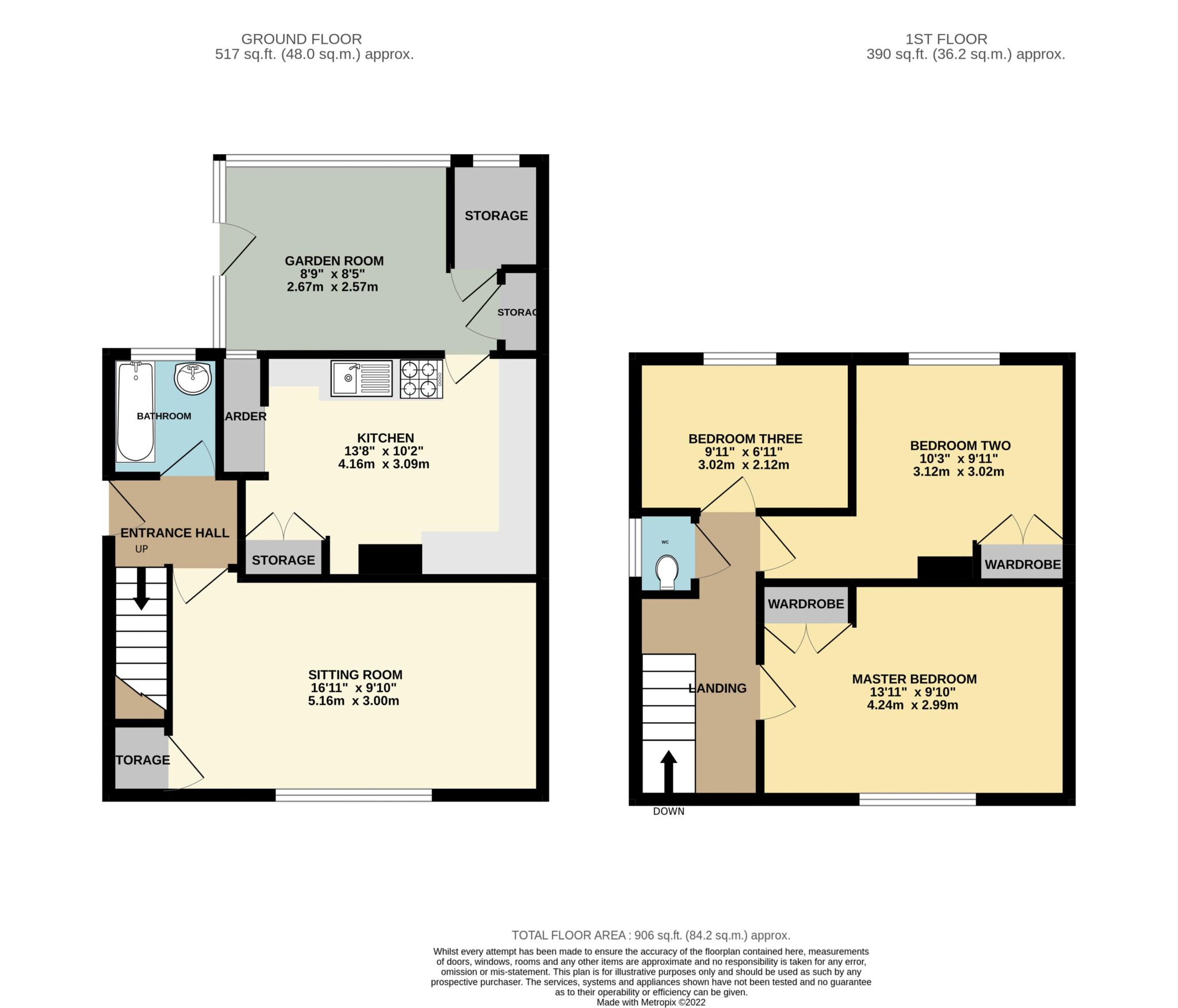 Approached via pathway to side door opening into the hallway with stairs rising to the first floor and doors to the kitchen, sitting room and bathroom. The sitting room has a fireplace and understairs storage, The kitchen has a walk-in larder, various wall and base units and door to the garden room. The garden room has two storerooms and further storage units plus door to the garden. Finally on the ground floor is the bathroom.
