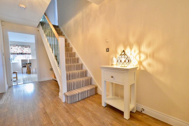 The property is approached via the paved driveway to the front door which opens into a large hallway with storage and doors to the main reception rooms. The spacious sitting room has a bay window to the front and the lovely fireplace as its focal point. The kitchen family room is fully fitted with an extensive range of modern wall and base units, integrated appliances including a new dishwasher, stunning lighting and double doors to the rear garden. Off the kitchen is a useful utility room with built-in washer dryer and access to the downstairs WC.